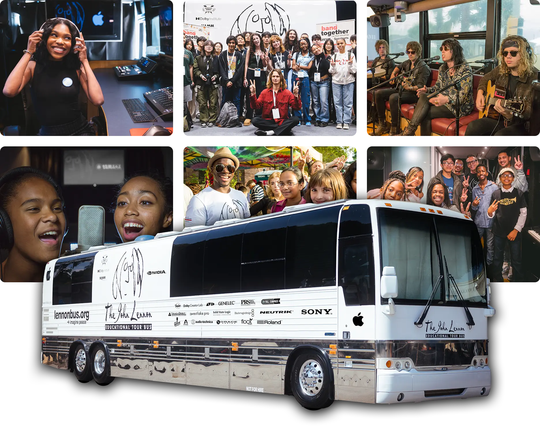 The John Lennon Educational Tour Bus has always been made possible by a community of artists, educators, and companies who want to inspire the next generation of creators and peacemakers including: Apple, Inc., Full Compass, Taylor, PRS, Genelec, Dolby, Grace Design, Avid, Blackmagic Design, Audio-Technica, SSL, Apogee, Triad-Orbit, Neutrik, Roland, Universal Audio, Native Instruments, The NAMM Foundation, Battle Born, SMM, Baker & McKenzie.